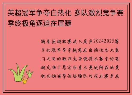 英超新赛季的揭幕战,历来都是球迷热议的焦点,无论是豪门球队的对决,还是新兴黑马的崛起,都让这个赛季充满了无限的期待。今年的英超联赛,竞争依然如火如荼,各大传统豪门纷纷在夏季转会市场加大投入,补强阵容,...